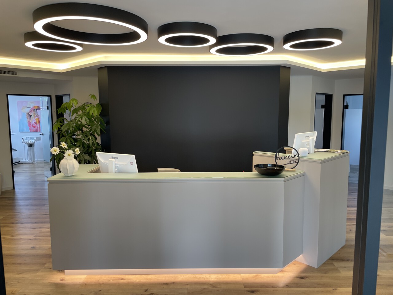 Die Rezeption ist das Herz der Praxis. Alle Räume haben ihren Eingang über diesen Raum. Alle Fäden laufen hier